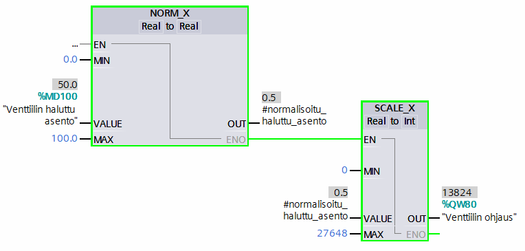 Tehdään skaalaus mallin mukaisesti. Signaalin vieminen NORM_X-toimilohkosta SCALE_X-toimilohkoon voidaan tehdä paikallisella Real-tyyppisellä välimuuttujalla (Temp), jolle on alla olevassa esimerkissä annettu nimi LI-100-norm (klikkaa isommaksi):