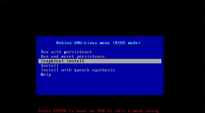 - Valitse ilmestyvästä valikosta Graphic Install. Hiiri ei tässä vaiheessa vielä toimi, joten valinta pitää tehdä alanuolta pari kertaa näppäämällä!