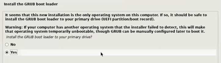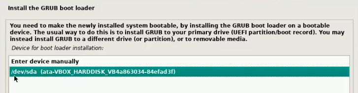 Varmista, että valittuna on Yes ja klikkaa - Valitse kiintolevy, jolle GRUB asennetaan. Valitse rivi, jonka alussa on hakemisto /dev/sda ja klikkaa