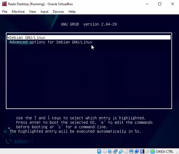 - Asennusohjelma siivoaa jälkensä, minkä jälkeen virtuaalikone käynnistyy uudelleen; tällä kertaa GRUBiin, jossa voidaan valita käynnistettävä käyttöjärjestelmä. Debian GNU/Linux on oletuksena valittu ja se käynnistyy automaattisesti viiden sekunnin kuluttua.