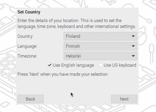- Valitse maa-asetukset (Suomi/Suomi/Helsinki). Itse haluan myös käyttöjärjestelmän tekstien olevan "alkuperäisiä" eli englanniksi, koska käännökset eivät aina ole kovin hyviä, joten laitan väkäsen ruutuun Use English language. Klikkaa