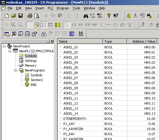 Kuten jokaisessa sovelluksessa, myös sekvenssiohjelmassa tulee ensin täyttää symbolitaulukko, jossa määritellään mm. kutakin askelta vastaava siirtorekisterin bitti omalla nimellään. Alla on osa vedenkäsittelysekvenssin symbolitaulukosta.