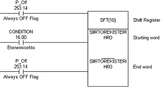 Tämä kuva on CPM1-tyyppisen logiikan ohjelmasta, jolloin siirtorekisterin käyttämä muistipaikan osoite on HR0. CP1L-tyyppisellä logiikalla (jota projektissa käytetään) muistipaikan osoite kirjoitetaan muodossa H0. Muistialue on molemmissa tapauksessa sama; vain merkintätapa on erilainen (HR -> H).